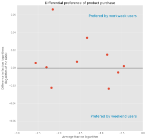 Let’s look for more subtle differences. We’ll use a technique known as a Bland / Altman Plot. These British statisticians noted that plotting one value versus another implies that the one on the X axis is the cause, and the one on the Y axis is the result. An alternative implication is that the X axis represents the “correct value”. None of these is correct in our case. We are interested in understanding the agreement (disagreement, to be more precise) between two similar measurements when none of the two is superior over another. Thus, instead of plotting the two closely correlated metrics (purchase fractions in our case), we should plot their average values on the X axis and their difference on the Y axis. In this domain, higher X axis values designate more prevalent products, positive Y values designate preference towards the working days and negative Y values designate preference towards the weekend. This is what we get after transferring the fractions to logarithm domain: