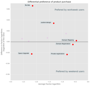 As I have already mentioned, domain mapping and registration are the most popular products. Not surprisingly, these products are equally liked by weekend and working week users. Recall our initial intuition that users who register during weekends will be more hobby‑oriented and users that register during the week will be more job oriented. We now have some data that supports this intuition. Of all the products, private registration, followed by space upgrades have the strongest bias towards weekend users. Indeed, one would expect personal users to care about their privacy much more than corporate ones. Being more cost‑sensitive, personal users are more likely to purchase space upgrade and not one of plans. The opposite side of the division line makes sense too: blocking ads is the cheapest option to differentiate a workplace site, followed by custom design. These two options are included in all our premium plans, but I can understand how a really small business would prefer buying some individual options.