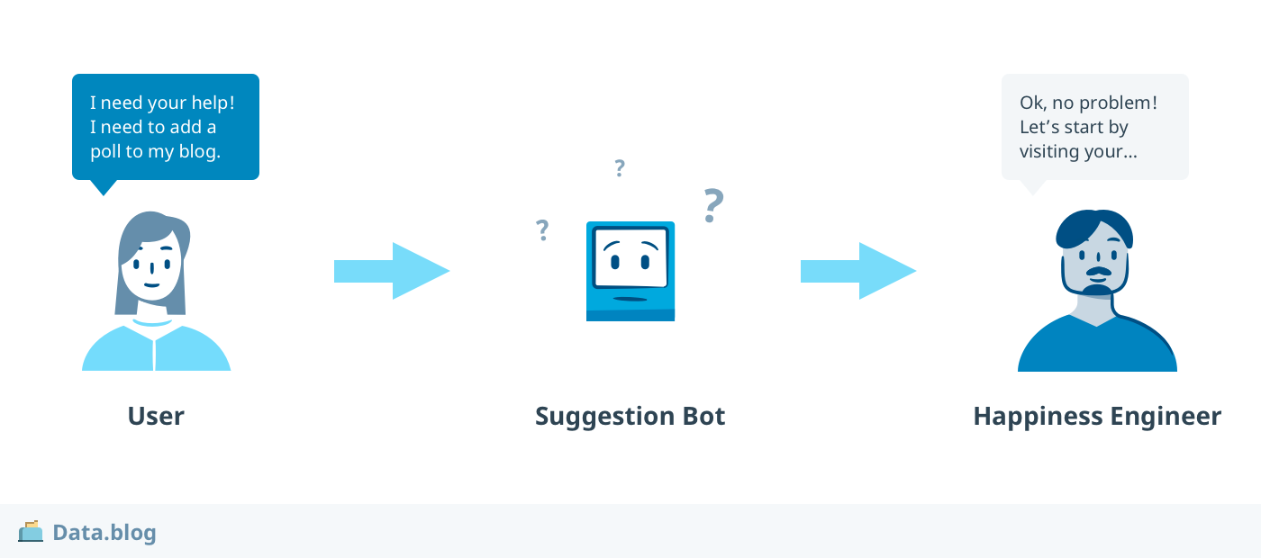 The Happiness Engineer would glance at the suggestion, and if acceptable, could send it to the user or modify it as they see fit. For more complex questions, the suggestion bot (I’ll just call it a bot for short) remains silent while the HE interacts with the user. The bot should be able to recognize when questions are outside its expertise.