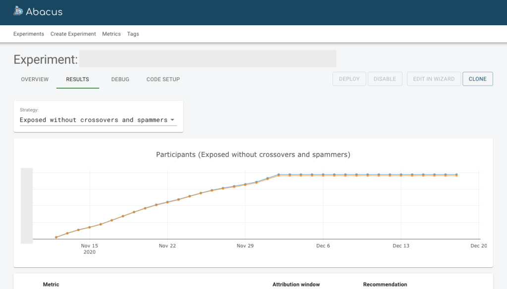 The experiment management UI is called Abacus and is an open source project. It is where experimenters go to set up, deploy, and analyze their experiments. Abacus allows everyone at Automattic to run and analyze their experiments, not just engineers and data scientists. The UI helps people schedule their experiments, visualize experiment results, and remotely start and end experiments.