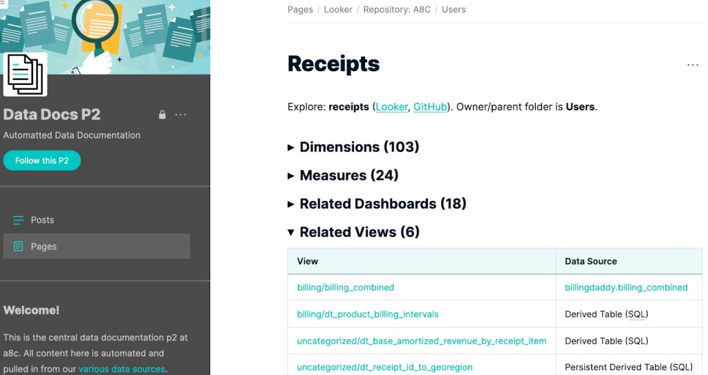 Our users and developers are interested in having accessible information on Looker’s containers and hierarchies (models, views, explores…) and fields (dimensions, measures…). Fortunately, Looker offers API access, and its project files are also versioned via GitHub.