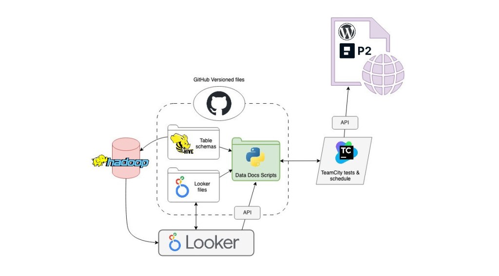 In short, the recurrent interactions of these four elements make it possible to publish our target metadata. We have dedicated Python scripts that TeamCity executes on a daily basis. They crawl and inspect files in our cluster, versioned and updated via GitHub, and then extract the information we need and publish it in a friendly format to WordPress‑based P2 pages that are accessible and searchable by our main internal tools.