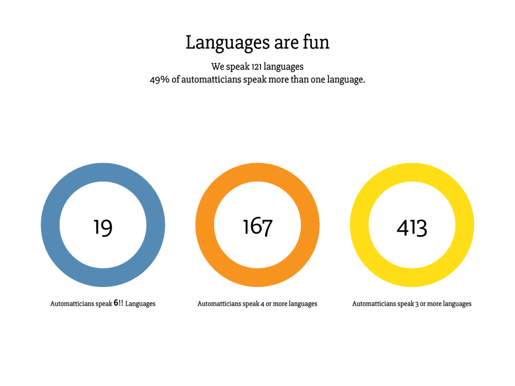 We relish celebrating differences by acknowledging the 121 languages we speak at Automattic at this moment. Some of the most commonly spoken languages include English, Spanish, French, German, Portuguese, and Japanese. But we also have 37 one‑speaker languages: Akan, Armenian, Balinese, Basque, Chadian Arabic, Dhivehi, Esperanto, Estonian, Faroese, Frisian, Hmong, Hokkien, Iloko, Irish, Kabyle, Kannada, Kashmiri, Kazakh, Kikuyu, Konkani, Latgalian, Lingala, Maithili, Nepali, Norwegian (Nynorsk), Odia, Piedmontese, Sanskrit, Somali, South Ndebele, Sundanese, Thai, Tibetan, Toki Pona, Tunisian Arabic, Turkmen, and Twi. We believe that having a multilingual team helps us better serve our global users and create products that are accessible to everyone.