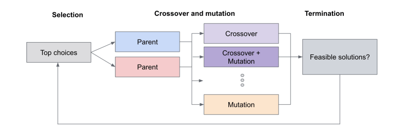 - Create new permutations (generations) by crossing over and mutating the top choices.