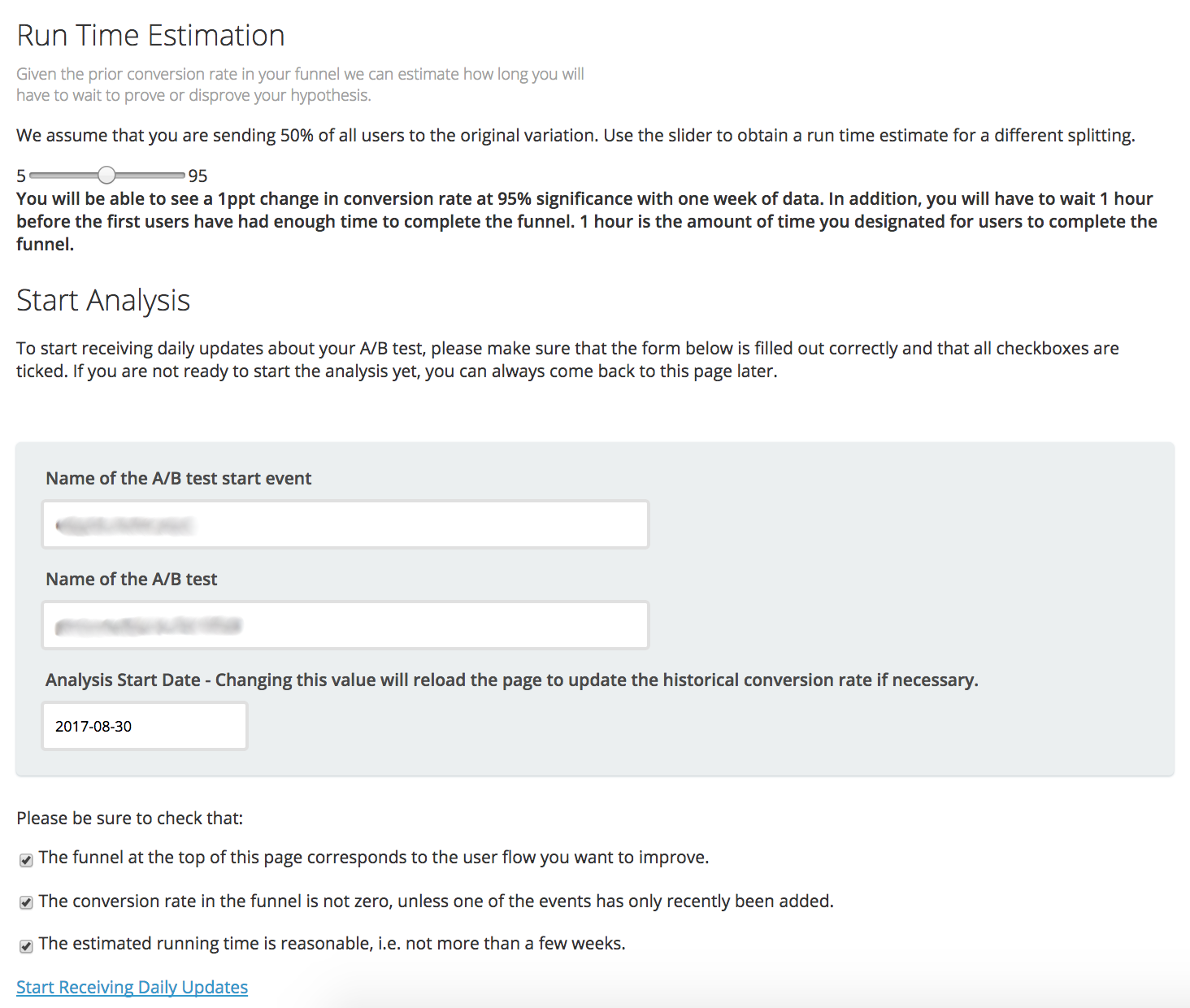 In the last section of the web interface, the user has to provide additional information about the test: the start date of the test, the name of a tracking event that will be used to identify which users were assigned to each variation of the test, and an identifier for the A/B test itself. Before users can start receiving daily updates, they have to confirm that the analysis set up corresponds to what they want to test, that the historical conversion rate is not zero unless it is expected to be, and that the estimated running time is not longer than a few weeks.